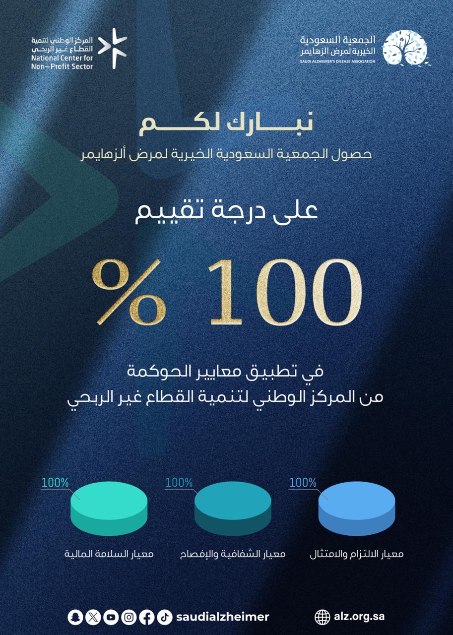 حققت الجمعية السعودية الخيرية لمرض الزهايمر إنجازًا مؤسسيًا يضاف إلى سجل نجاحاتها، بحصولها على تقييم 100% في مؤشر الحوكمة الصادر عن المركز الوطني لتنمية القطاع غير الربحي، لتؤكد مكانتها كإحدى الجمعيات الرائدة في تطبيق أفضل معايير العمل المؤسسي في المملكة.