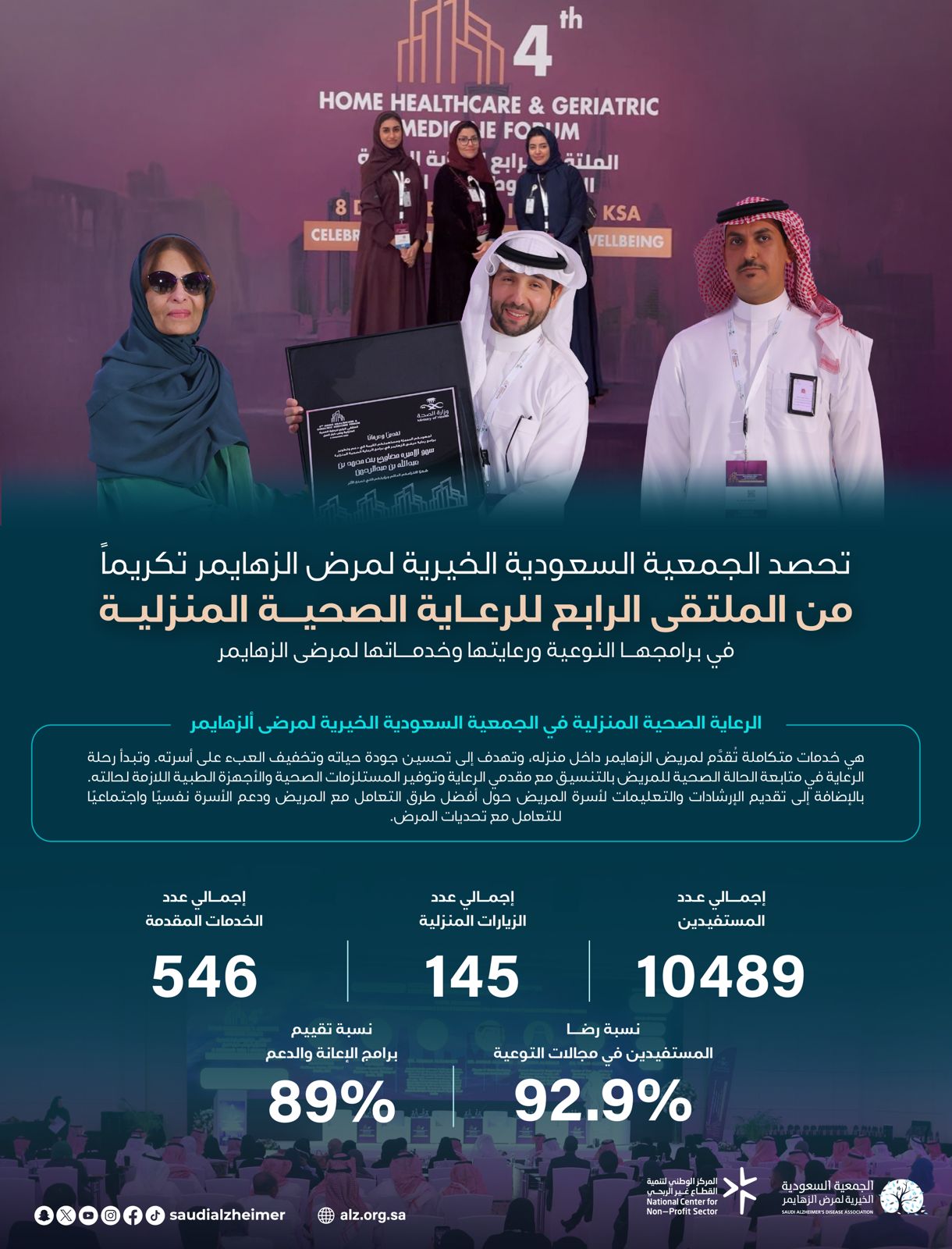 نالت الجمعية السعودية الخيرية لمرض ألزهايمر تكريمًا متميزًا خلال مشاركتها في الملتقى الرابع للرعاية الصحية المنزلية، وذلك تقديرًا لجهودها النوعية في تطوير برامج الرعاية المنزلية وتحسين جودة الخدمات المقدمة لمرضى ألزهايمر وأسرهم والتي تشمل كافة مناطق المملكة من خلال الشراكة الاستراتيجية مع وزارة الصحة.