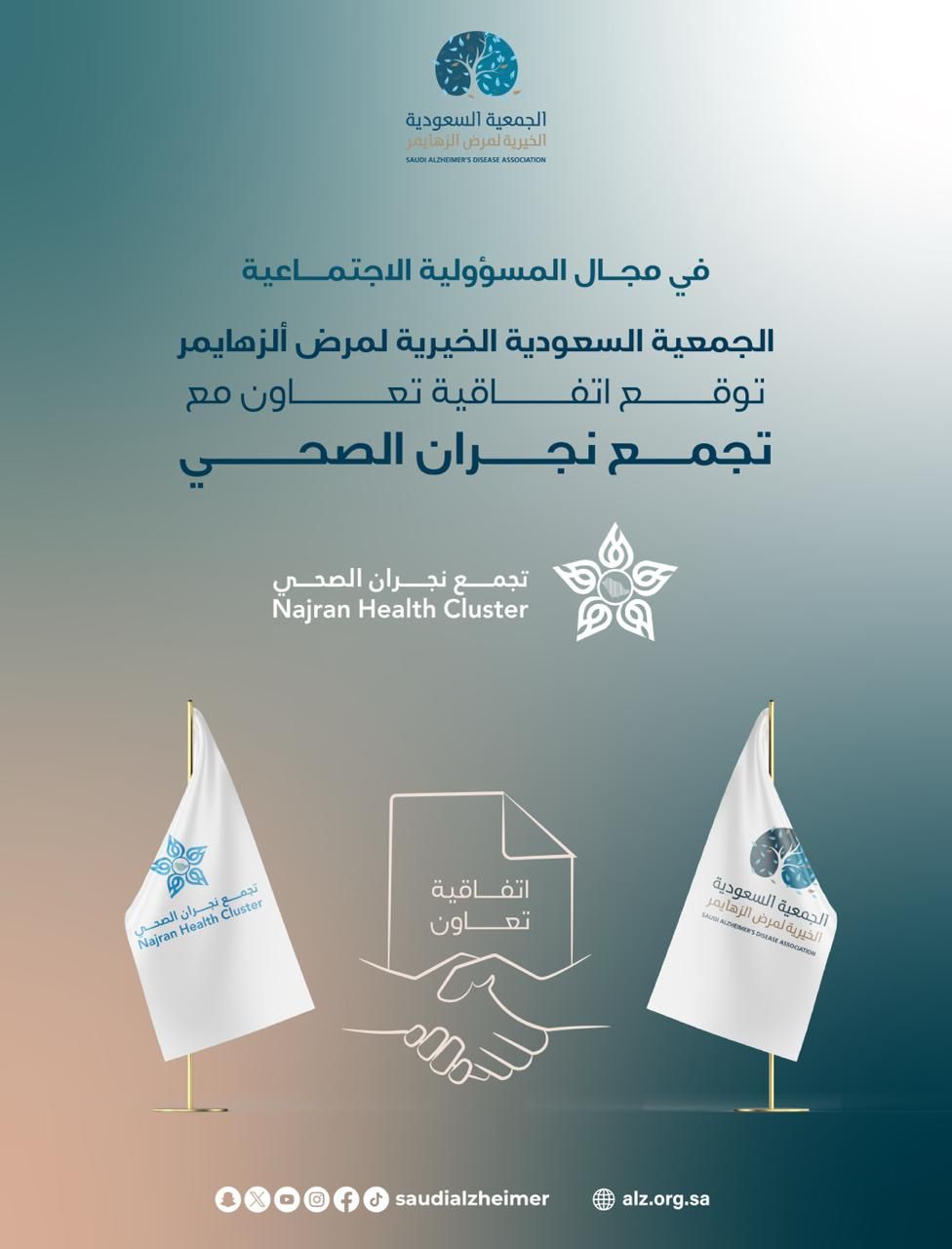 في إطار تعزيز المسؤولية الاجتماعية وتفعيل الشراكات المجتمعية، وقعت الجمعية السعودية الخيرية لمرض الزهايمر اتفاقية تعاون مع تجمع نجران الصحي، وذلك بهدف توحيد الجهود وتكامل الخدمات الصحية والتوعوية المقدمة لمرضى الزهايمر وأسرهم.